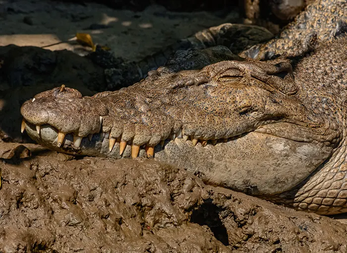 A little surprisingly crocodiles are quite communicative - both by using body language and audible sounds. The croc above yawned spectacularly (the jaws in this pic are about half-way open) and such displays are probably a warning to interlopers that the animal is not in the mood to be trifled with.